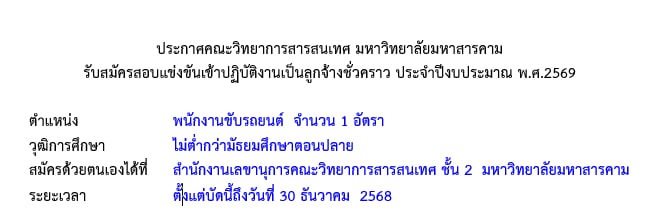 ประกาศ คณะวิทยาการสารสนเทศ มหาวิทยาลัยมหาสารคาม รับสมัครลูกจ้างชั่วคราาว รอบที่ 4 ประจำปีงบประมาณ พ.ศ.2569