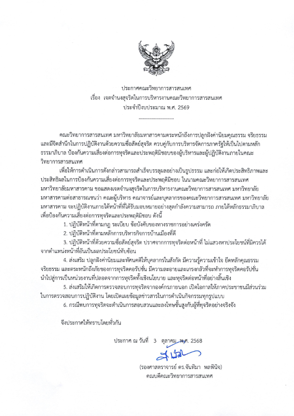 ข่าวประชาสัมพันธ์ประกาศคณะฯ เรื่อง เจตจำนงในการบริหารงานคณะวิทยาการสารสนเทศ ประจำปีงบประมาณ พ.ศ. 2569Date Published10/07/2025Categoriesข่าวประชาสัมพันธ์See all postsCategoriesข่าวกิจกรรมข่าวประชาสัมพันธ์ข่าวรับสมัครงานข่าวจัดซื้อจัดจ้าง