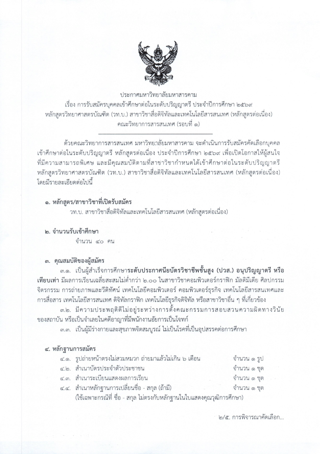 ข่าวประชาสัมพันธ์ประกาศมหาวิทยาลัยมหาสารคาม เรื่อง การรับสมัครบุคคลเข้าศึกษาต่อในระดับปริญญาตรี DMIT หลักสูตรต่อเนื่อง ประจำปีการศึกษา 2569 (รอบที่ 1)Date Published11/20/2025Categoriesข่าวประชาสัมพันธ์⬇⬇⬇ สามารถคลิกเพื่อสมัครได้ที่นี่ ⬇⬇⬇คลิกเพื่อกรอกแบบฟอร์มSee all postsCategoriesข่าวกิจกรรมข่าวประชาสัมพันธ์ข่าวรับสมัครงานข่าวจัดซื้อจัดจ้าง