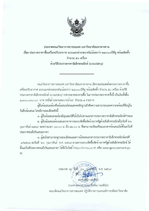 ประกาศคณะวิทยาการสารสนเทศ มหาวิทยาลัยมหาสารคาม เรื่อง ประกวดราคาซื้อเครื่องปรับอากาศ แบบแยกส่วนขนาดไม่น้อยกว่า ๒๔๐๐๐บีทียู พร้อมติดตั้งจำนวน ๕๐ เครื่อง ด้วยวิธีประกวดราคาอิเล็กทรอนิกส์ (e-bidding)