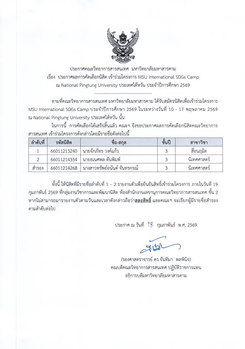 คณะวิทยาการสารสนเทศ มหาวิทยาลัยมหาสารคาม ประกาศผลการคัดเลือกนิสิตเข้าร่วมโครงการ MSU International SDGs Camp ณ National Pingtung University ประเทศไต้หวัน ประจำปีการศึกษา 2569
