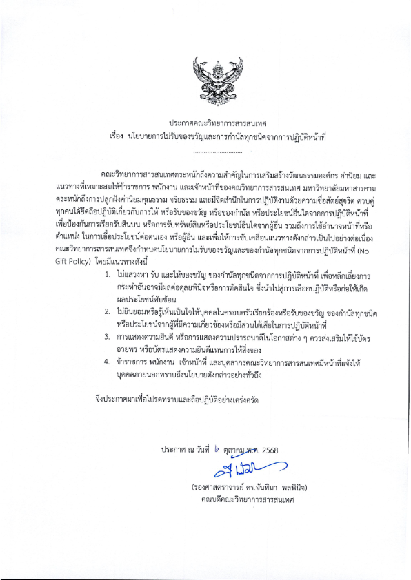 ข่าวประชาสัมพันธ์ประกาศคณะฯ เรื่อง นโยบายการไม่รับของขวัญและการกำนัลทุกชนิดจาการปฏิบัติหน้าที่Date Published10/07/2025Categoriesข่าวประชาสัมพันธ์See all postsCategoriesข่าวกิจกรรมข่าวประชาสัมพันธ์ข่าวรับสมัครงานข่าวจัดซื้อจัดจ้าง