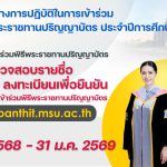 แนวทางการปฏิบัติในการเข้าร่วมพิธีพระราชทานปริญญาบัตร ประจำปีการศึกษา 2567 (ข้อมูลจาก : กองกิจการนิสิต : วันที่ 1 พฤศจิกายน 2568) ขอให้ผู้มีสิทธิ์เข้าร่วมพิธีพระราชทานปริญญาบัตร ตรวจสอบรายชื่อและลงทะเบียนเพื่อยืนยันการเข้าร่วมพิธีพระราชทานปริญญาบัตร ที่ https://banthit.msu.ac.th…
